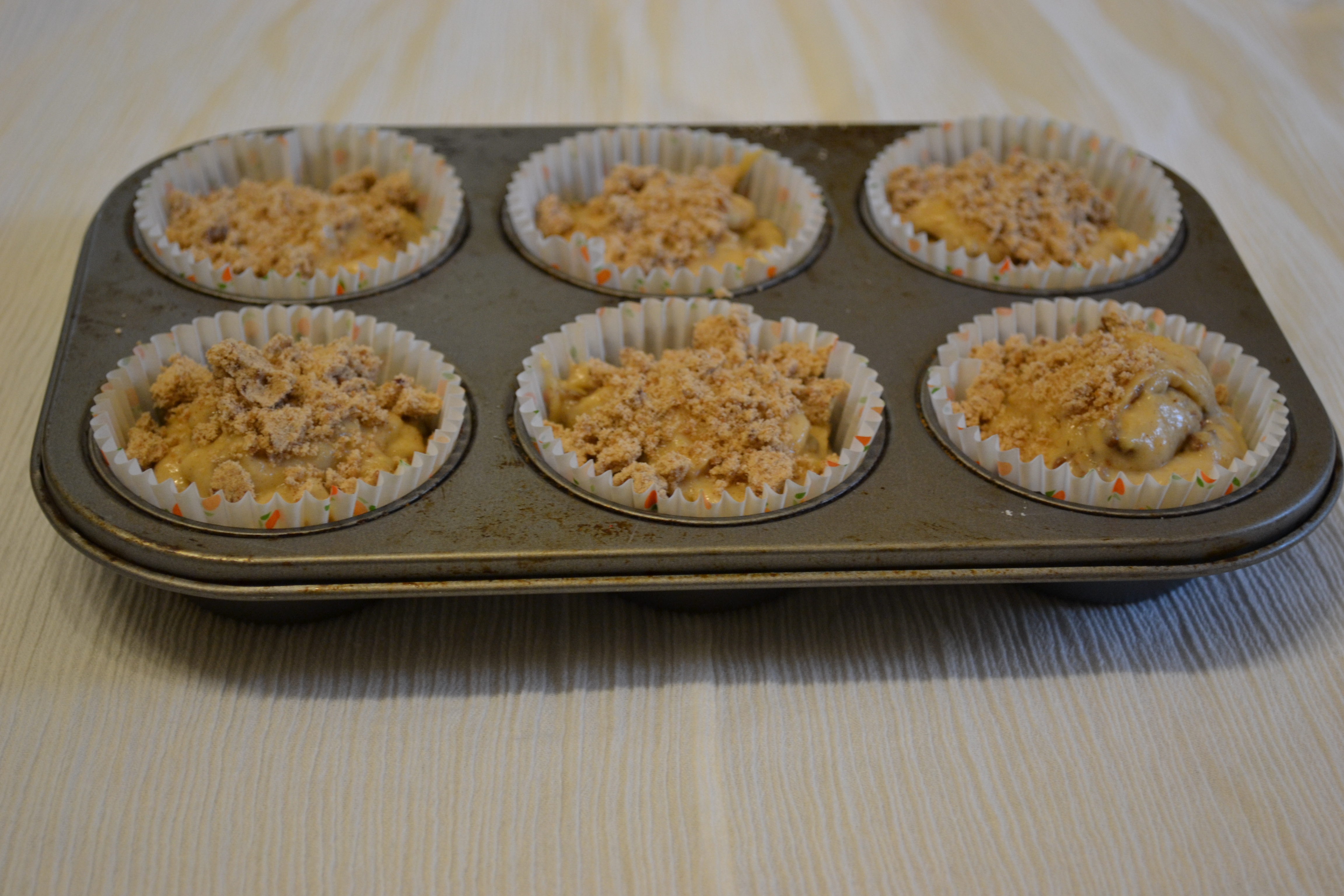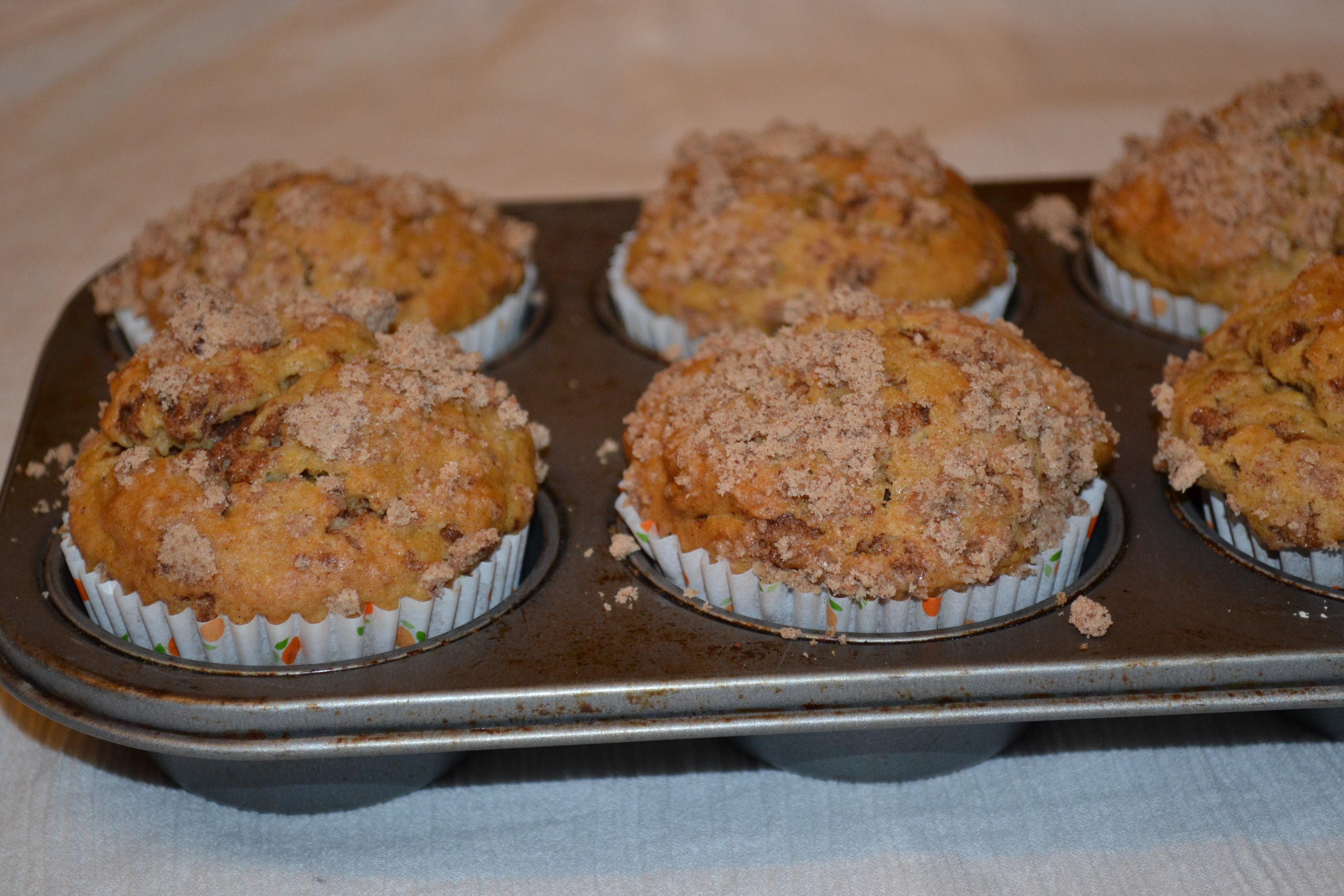 A good tip would be to add some of the streusel in the middle of the muffin batter as well.Also the addition of honey gives it a
