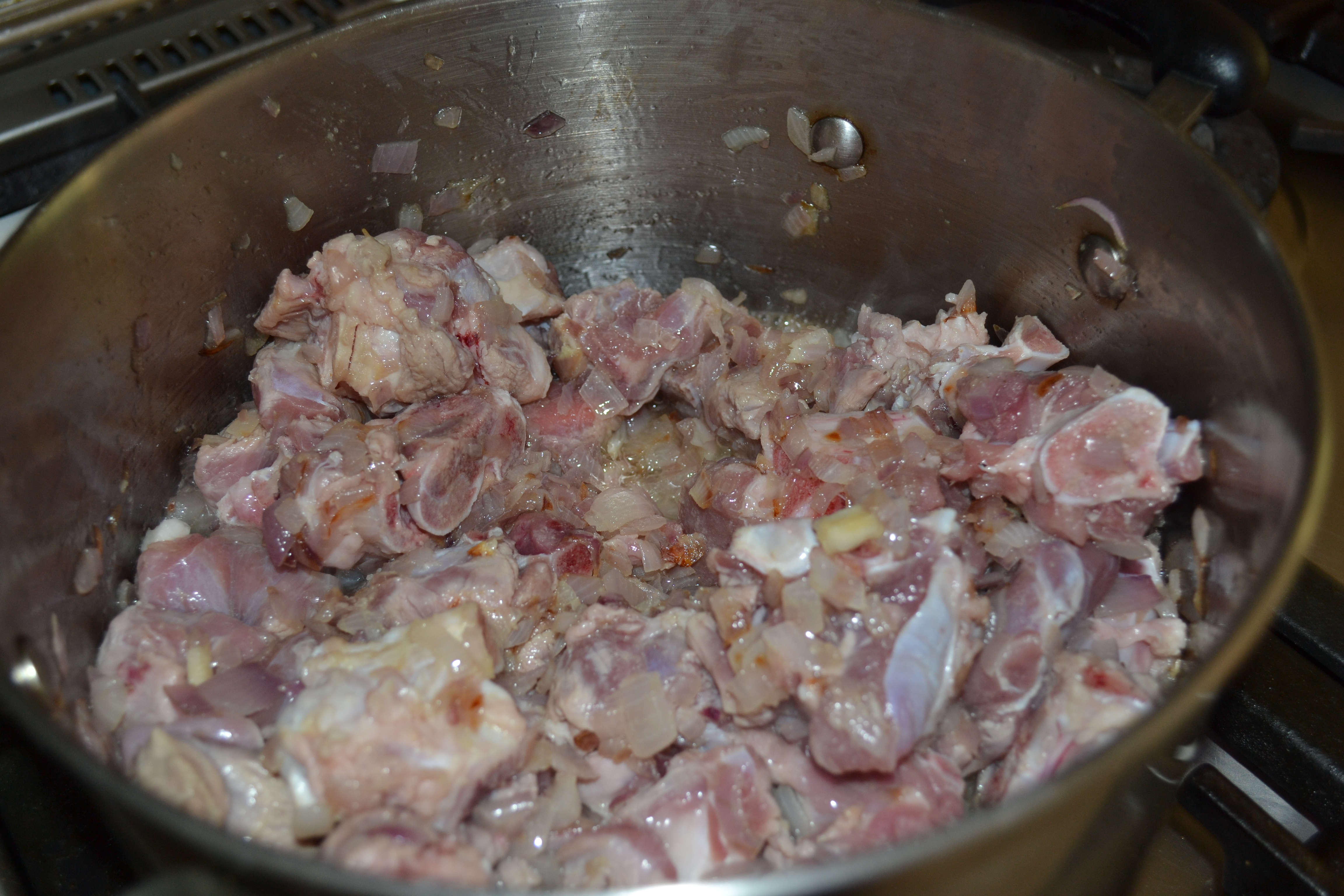 - At this stage the meat can be added.Make sure the heat is turned up high so as to sear the meat and seal in the juices.