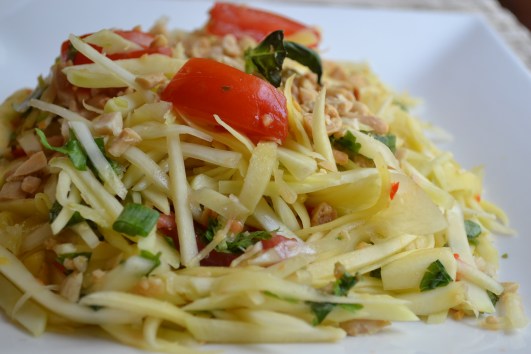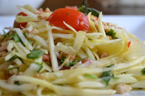 I’ve gone ahead and added a grated green mango to this papaya salad…Just makes it more tangier.Some other variations could be grated cucumber or even bean sprouts.