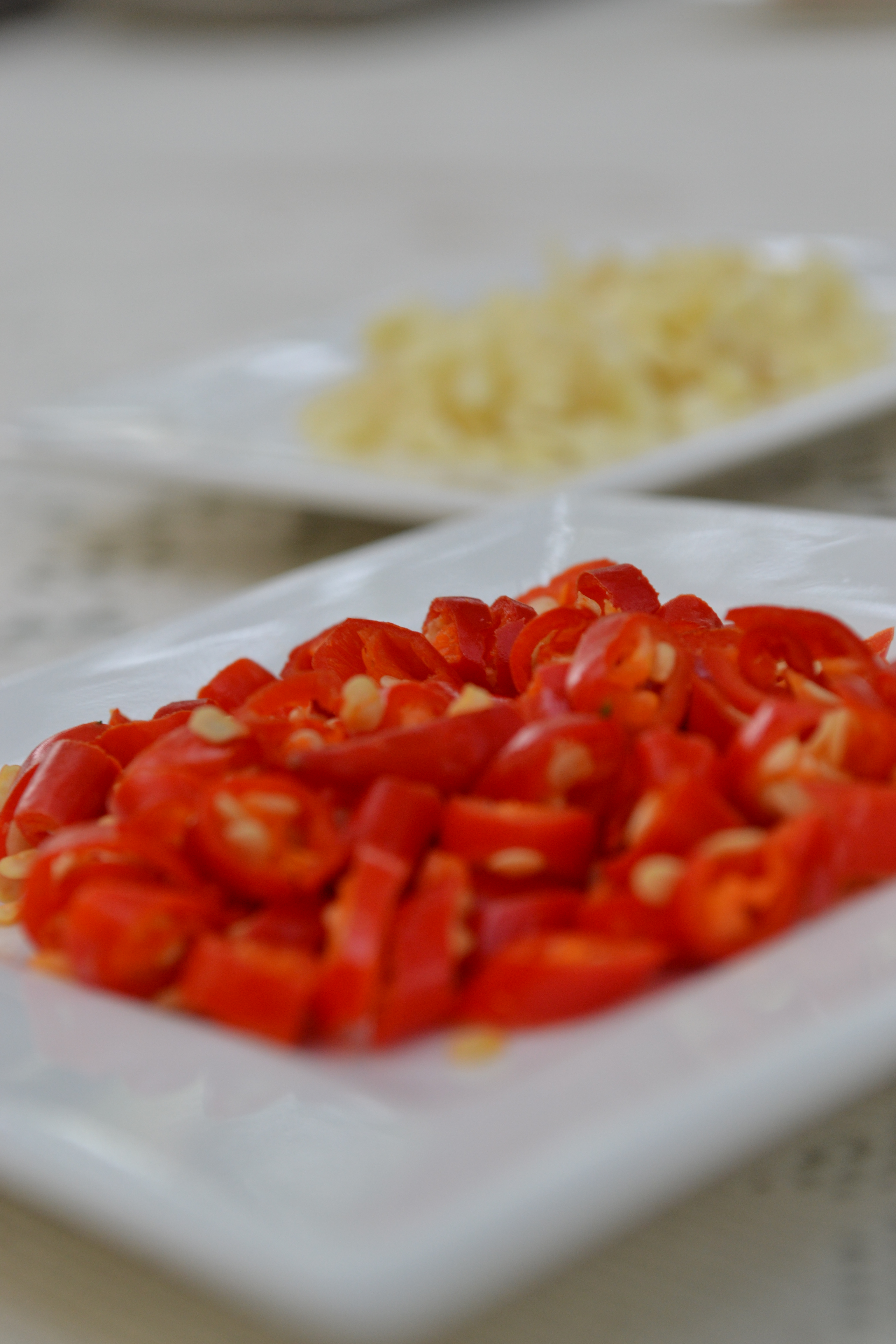 I just love the sweet and spicy flavours in this salad.The sweet mainly from palm sugar.I’ve just used regular sugar.The spice is by grinding the thai red chillies and garlic.Traditionally a mortar and pestle would be used to do this.I’ve just whizzed it in a small food processor.