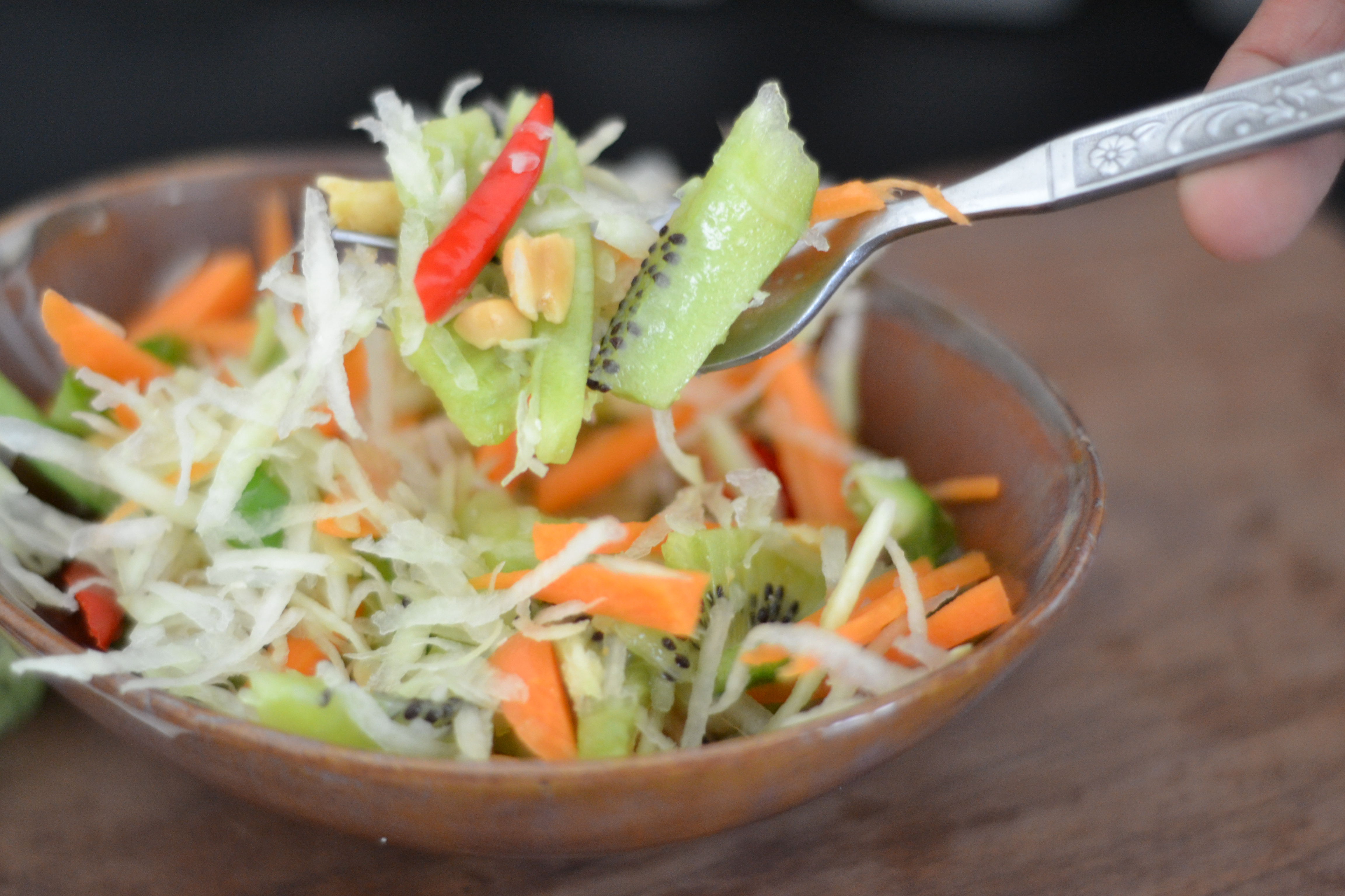 I’ve adapted this from my usual Thai Papaya salad that I make. The carrots used are a good variation and add a nice crunch to this salad. The kiwi fruit give this salad a burst of flavor and add a great Zing to it.