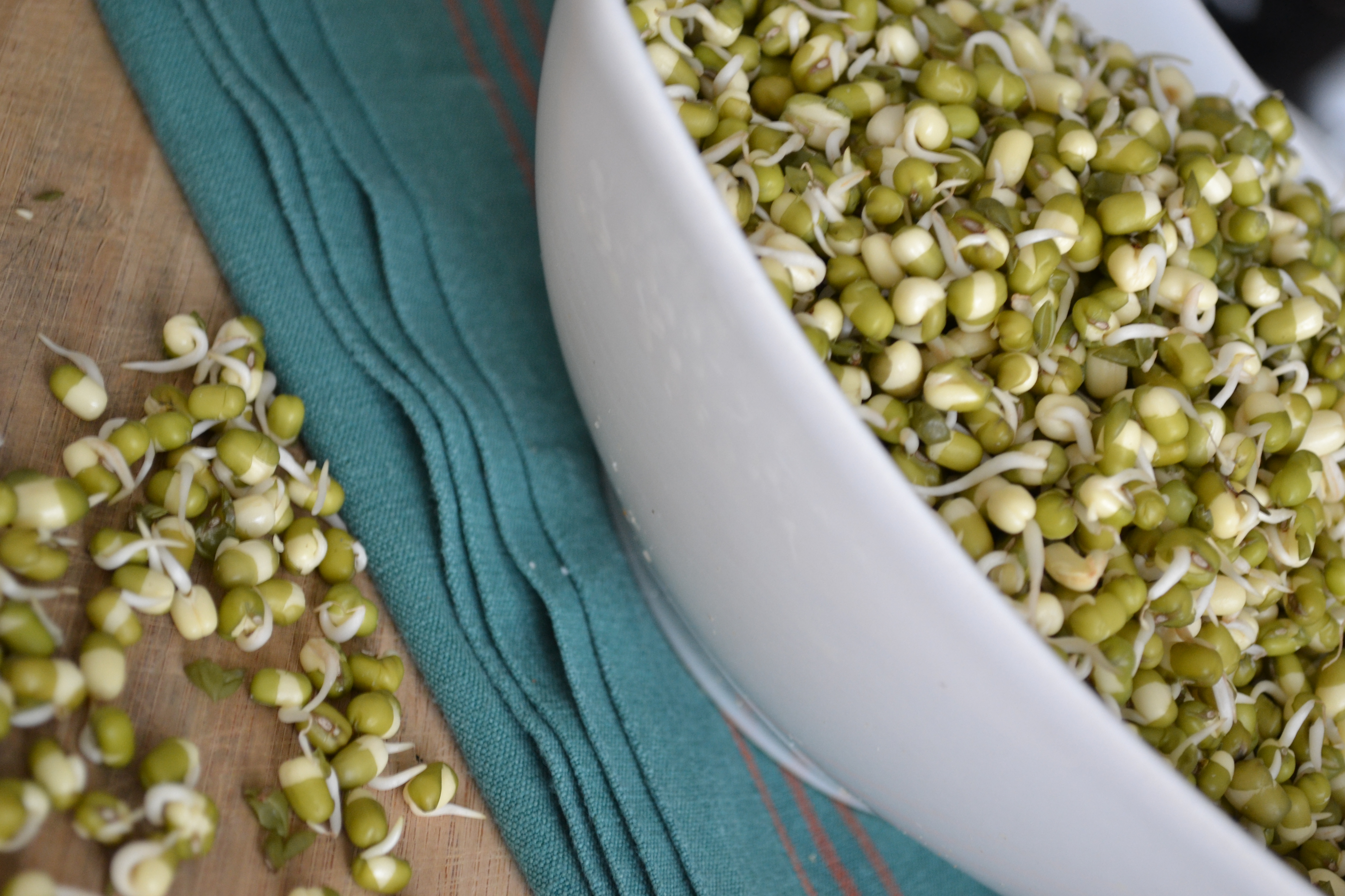 I’m reminded of the magic beans in ” Jack in the Bean Stalk”.These beans once soaked over night seems to sprout quite like magic the next day.The best way to sprout them is drain off the water and wrap the Moong in a kitchen towel and keep them covered with a lid on in a warm dark place.The kitchen oven works great for me. They sprout in about a couple of days depending on the warmth and humidity in your kitchen.