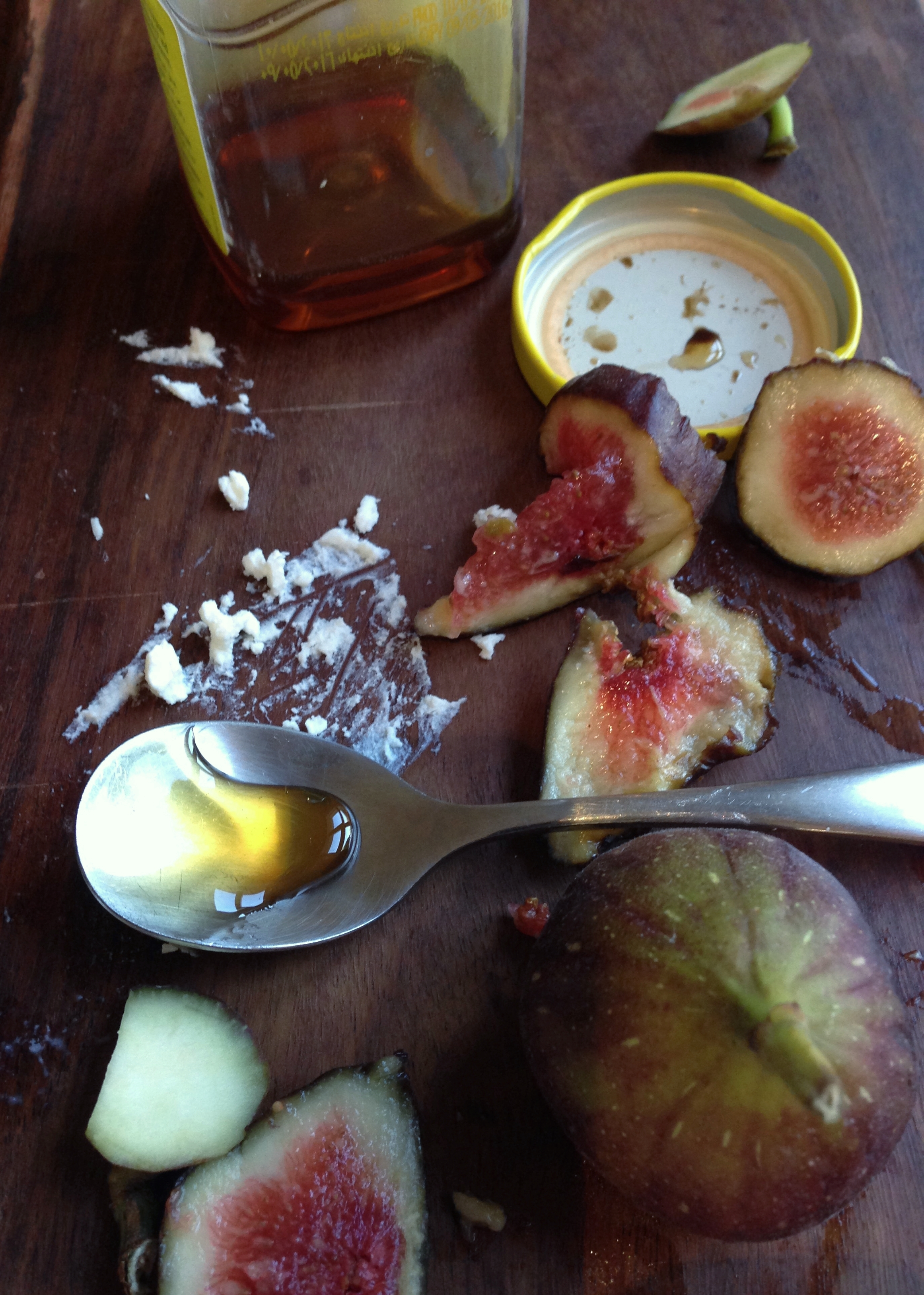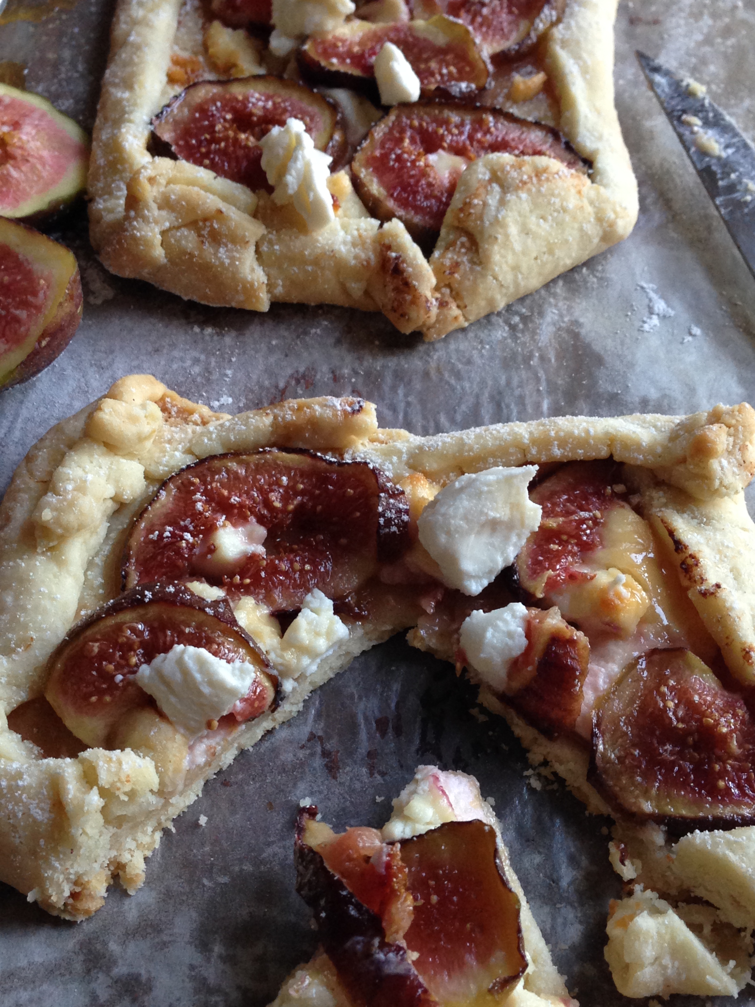 Sprinkle goat cheese over the bottom of the crostata (not the edges). Arrange the fig halves, cut side up, over the goat cheese and drizzle the figs with honey.