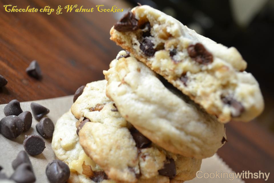 Oh  I do have a soft spot for Cookies of course and especially these gorgeous one’s which are loaded with chocolate chips and some walnuts that add a nice bite to them.I love the addition of nuts  when baking cookies.I feel they make the cookie more complete and add a nice texture to it as well. These are fairly easy and quick to bake up.If at any time you feel that the cookie dough seems soft,just refrigerate the dough for about 2o minutes before laying them on a baking tray.These bake really fast so do keep an eye on them to prevent them from burning.