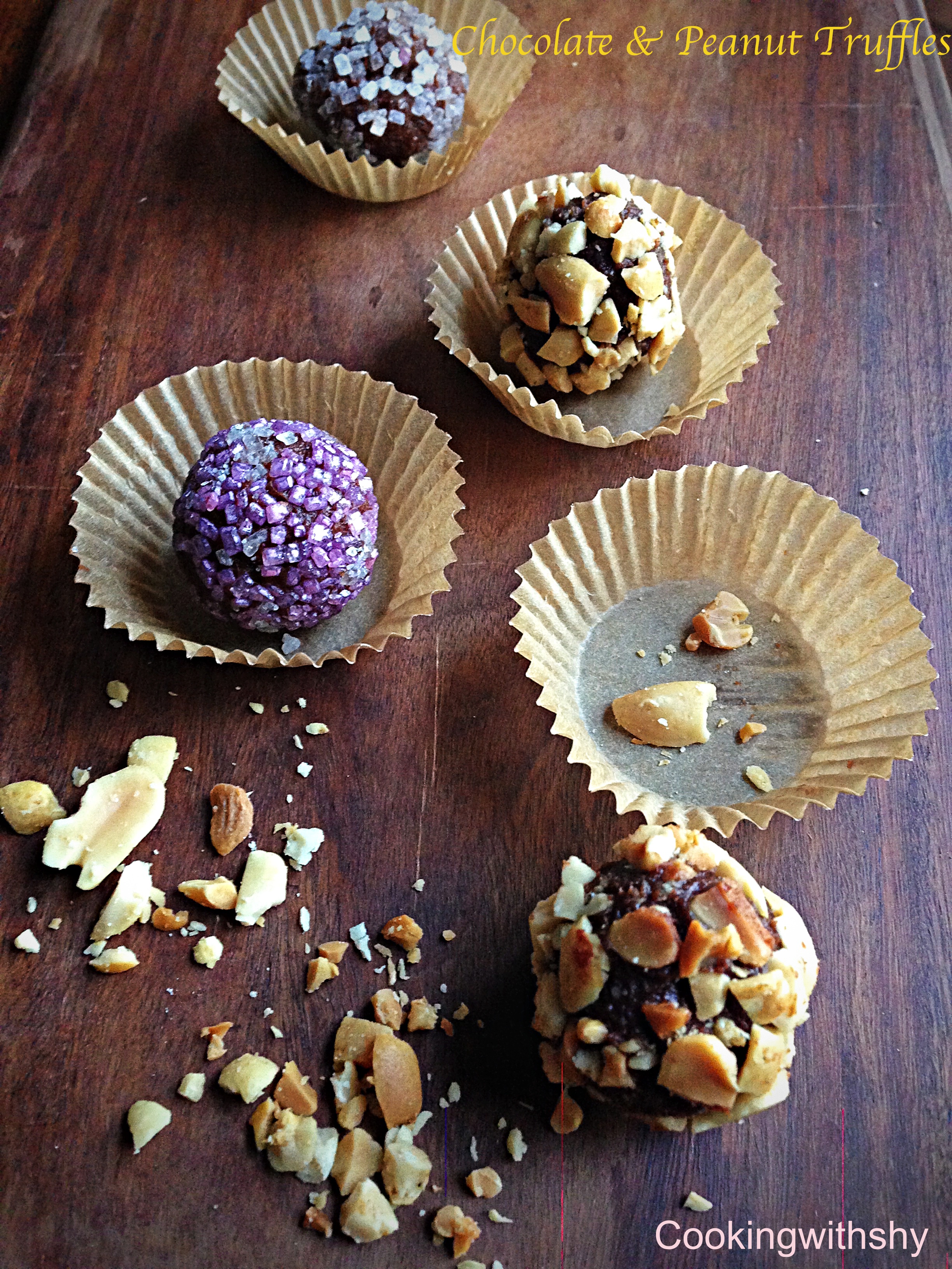 Chocolate and Peanut butter lovers are in for a treat with these oh so delicious mini truffles.I have been experimenting with a couple of recipes now.The recipe below is one which has been adapted from deliciouslyyum.com. All though ,I have tweeked the recipe and added my own twist by coating them with some crushed peanuts and sprinkles.Die hard chocoholics may even choose to leave them with a smooth chocolate coating.