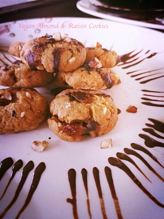 I’ve been following numerous blogs that bake up great vegan delights, all though baking without butter was something that needed be de-mystified.Browsing on the internet amongst a dozen recipes I  came across an easy Vegan Chocolate Chip recipe on Allrecipes and have adapted the following Vegan Almond & Raisin one.