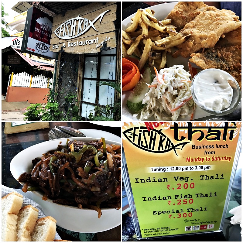Goa has numerous shacks that double up as bars and restaurants and are almost at every nook and cranny of the this beach town. Now some of the popular ones are located on the beach and are a great hang out spot and are perfect for relaxation and good food. Fishka as we discover, is a no frills kind of place with a relaxed laid back ambience.The menu is quite extensive which includes Goan dishes, Indian Chinese and International cuisine as well. The place as we learn is run by Indian-Russian duo and seems like a popular jaunt as there are not too many eating places in the vicinity. Our meal consists of some classic Lamb chilly fry served with some Poi (local goan bread), an all time favourite Fish and chips and I settle for a vegetarian paneer chili fry. A great place for a quick bite.