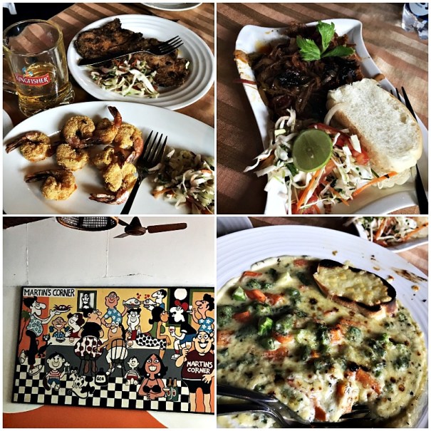 The property is gorgeous indeed and the monsoon’s seem to weave their own magic and bring about every shade of green possible. Well lets say we are prepared as predicted it had been raining incessently with some golden sunny interludes of sunshine in between and we were quite happy to sit back and enjoy every bit of “Goa in the Rains”. Having travelled to Goa on numerous occasions doing the usual touristy spots is far from what we wanted to do. But yes good food is always something the family is happy to explore.As luck would have it the ever popular Martin’s Corner is a quick drive from our hotel and the hub’s announced earlier that lunch must begin there. So that’s where we headed right after arriving at the hotel.