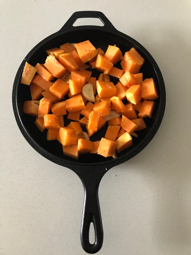 • Lay the cubed pumpkin pieces  & garlic in a single layer on a baking tray and drizzle with some olive oil.