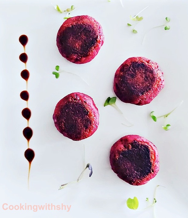 Beets make up for such flavorful recipes and work wonders in most salads, soups, sides and desserts. This recipe for a beetroot appetizer was shared by a dear friend Alyona kapoor on her Food Food channel recently. We made a batch of these recently and are absolutely hooked to the flavours. This recipe is slightly modified from the original one and have substituted Indian chat masala with the use of chili powder and raw mango powder. ( All spices are available at most Indian stores or International aisle across North America. These are so hearty and satiating along with a garden salad or perhaps served as a veggie slider option too, and sans the bun for a great gluten free meal.