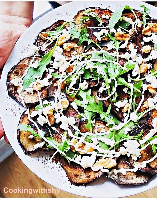 • Arrange the baked eggplant on a serving platter. Drizzle some tahini sauce. Now garnish with crumbled feta cheese, sprinkling of sumac and arugula leaves and toasted walnuts.