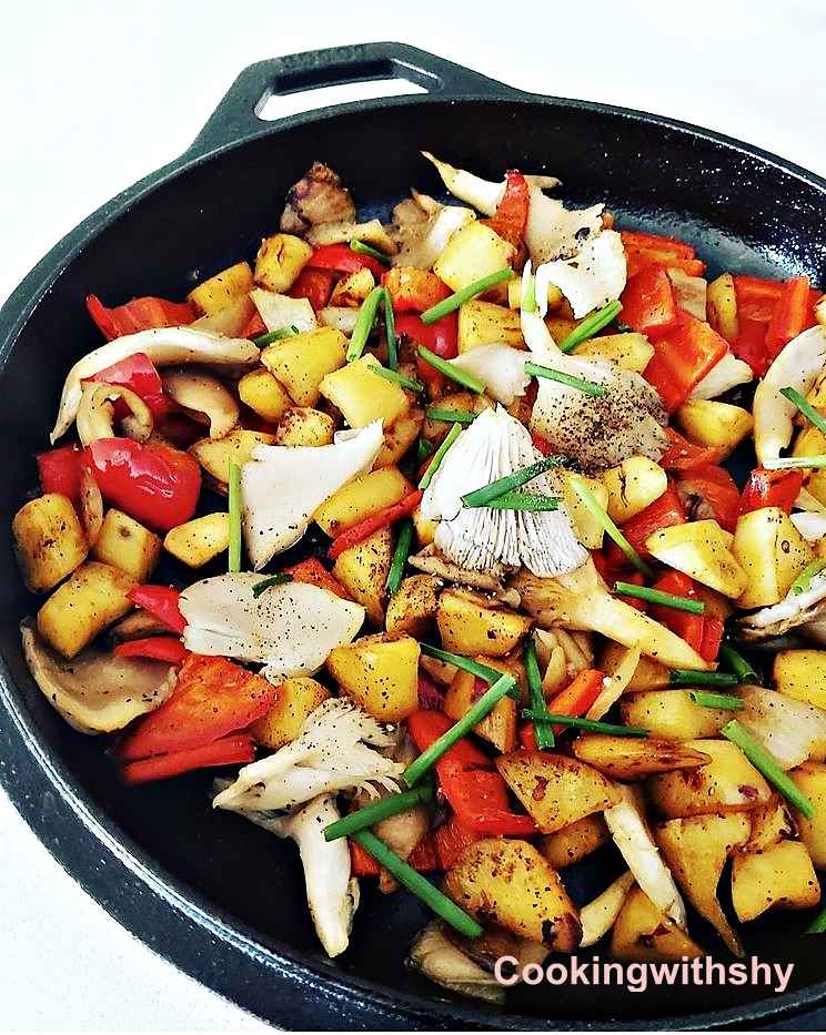 • Saute on medium heat for 20 minutes. Season with salt and pepper and garnish with fresh chives.