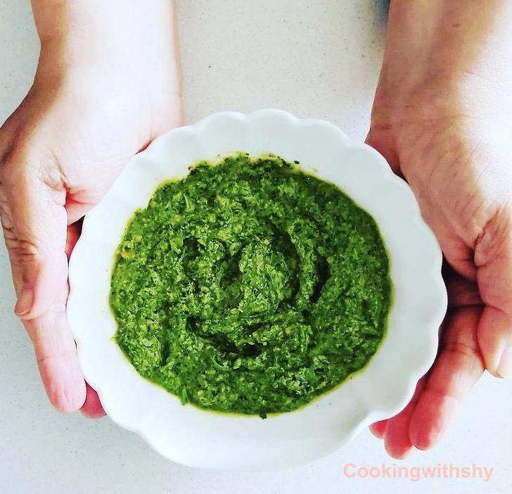 In this modern version the pine nuts are substituted with walnuts and the star ingredient is fresh Coriander leaves or Cilantro and just some basil leaves thrown in for good measure. All the ingredients compliment each other really well and trust me you will be tempted to eat this pesto by the spoonful.