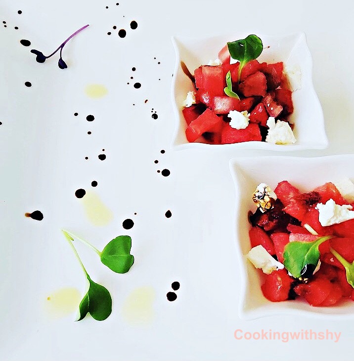 2. Diced Watermelon & Feta ( with Balsamic drizzle and Radish Microgreens):