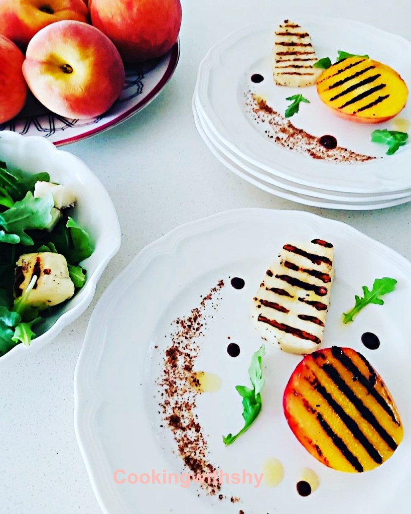 However I did want to experiment with grilling some of these peaches. I went ahead and did so and paired them with some grilled halloumi cheese and Arugula. This turned out just delightful. Grilling the peaches elevates the flavours and adds a burst of fresh summer flavors. Peaches are summer’s greatest delight and can be used in various salads and desserts too.