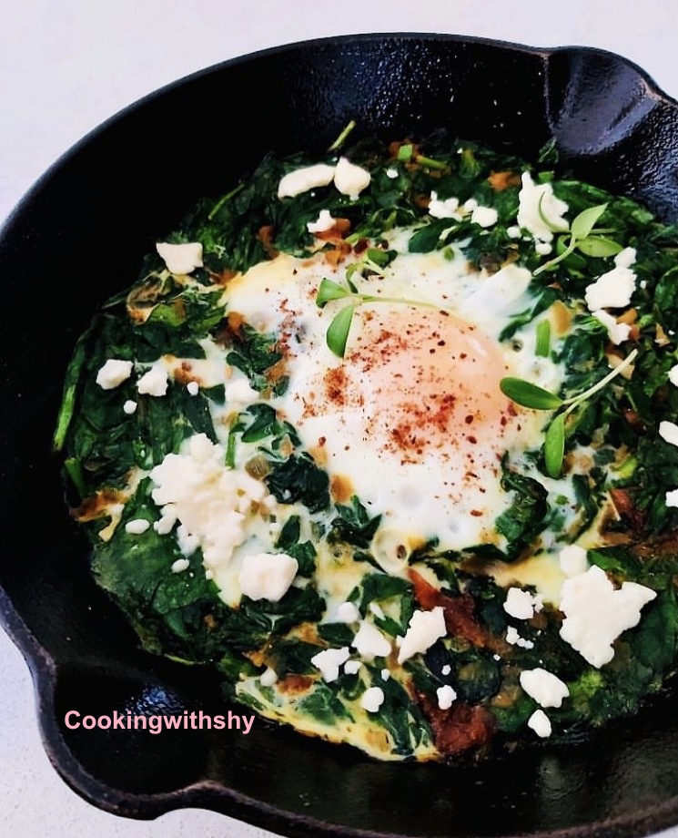 1.Green Goodness Shakshuka: ( Eggs poached in sauteed baby spinach)