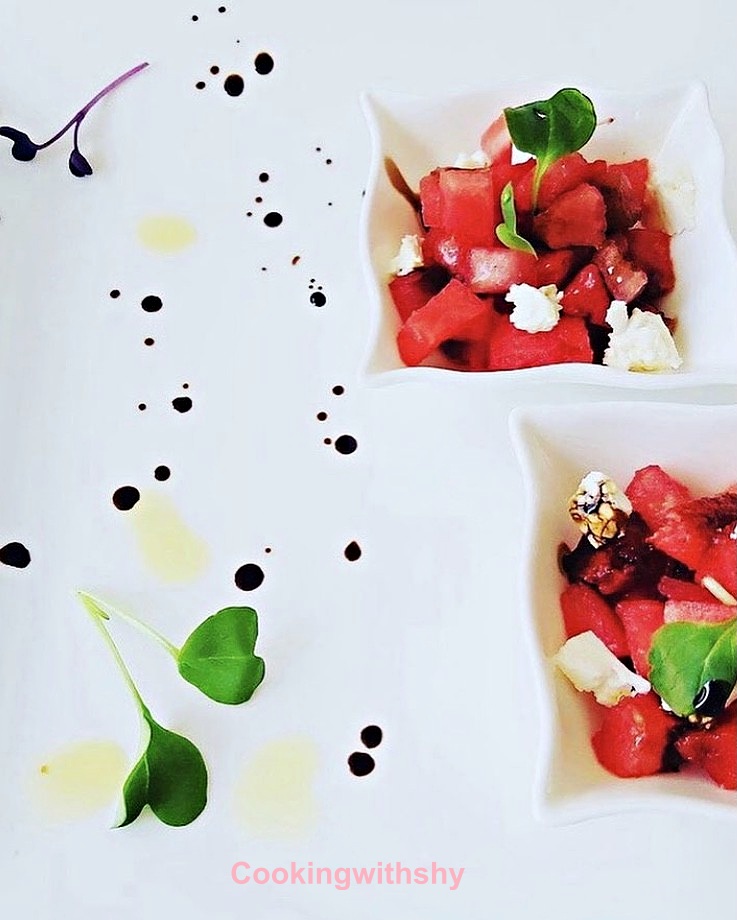 Simple ingredients here call for diced watermelon, crumbled feta cheese and some radish microgreens that add a great crunch and add to the visual appeal as a garnish too. You may choose any garnish of your choice. Microgreens are chock a full nutrients, vitamins and beta carotene compared to the mature plants. You may buy store bought ones that include a variety of microgreens like kale, beet, peas shoots, broccoli or even perhaps sunflower and wheatgrass. This summer salad ticks off all the boxes.