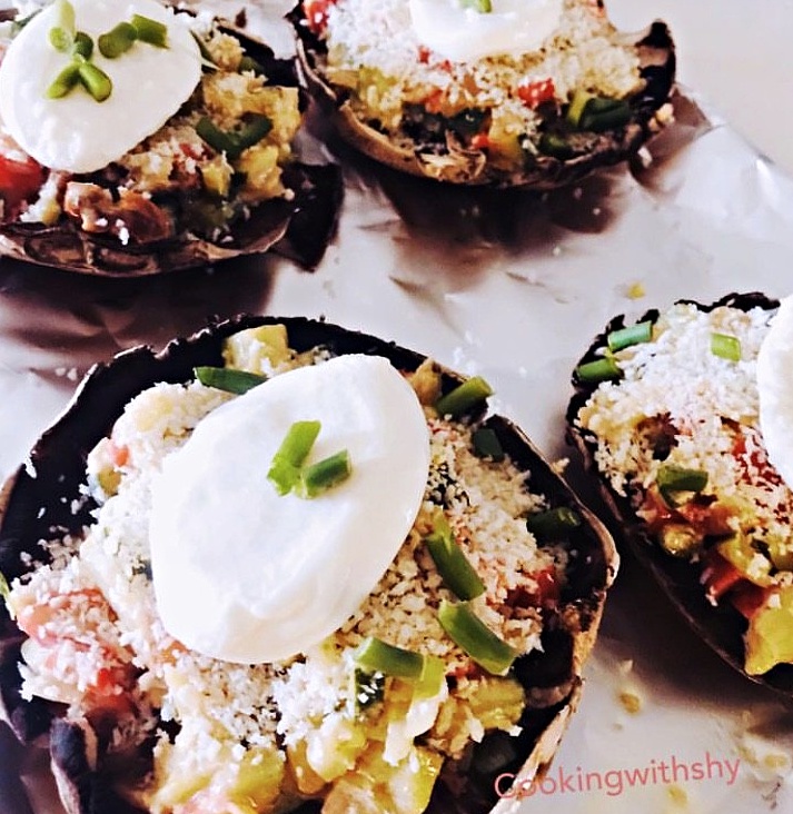 - Divide the mixture in four parts and stuff each mushroom cap with this.
