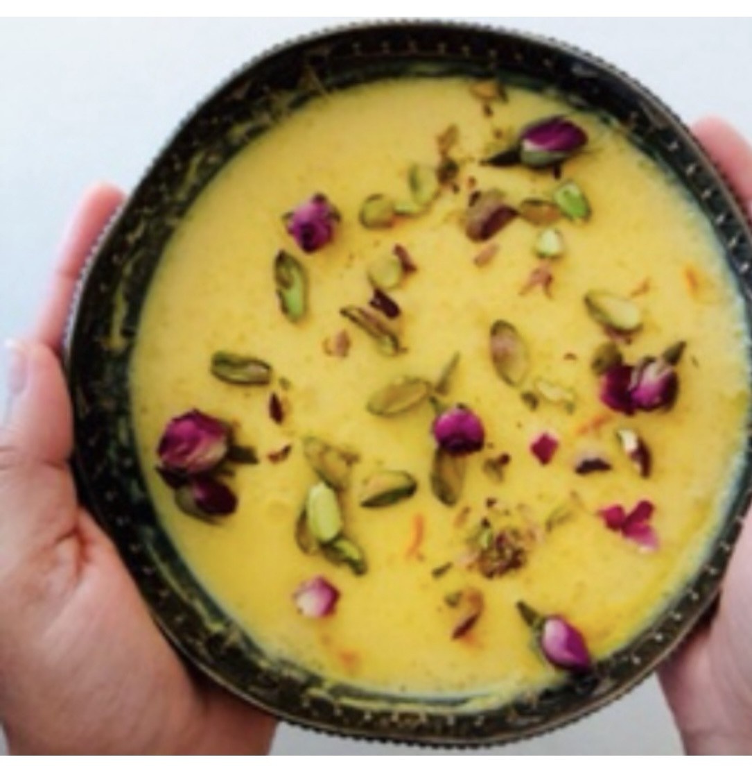 - Garnish with chopped dry fruits and crushed cardamom and dried rose petals.